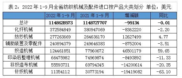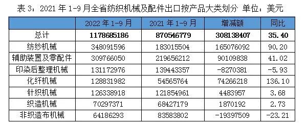 2022年1至9月全省纺织机械及配件进出口总额 23.28亿美元,同比增长15.25%。其中进口11.49亿美元,同比下降0.01% ,出口11.79亿美元,同比增长 35.40%,前三季度出口总额及增幅好于进口指标。