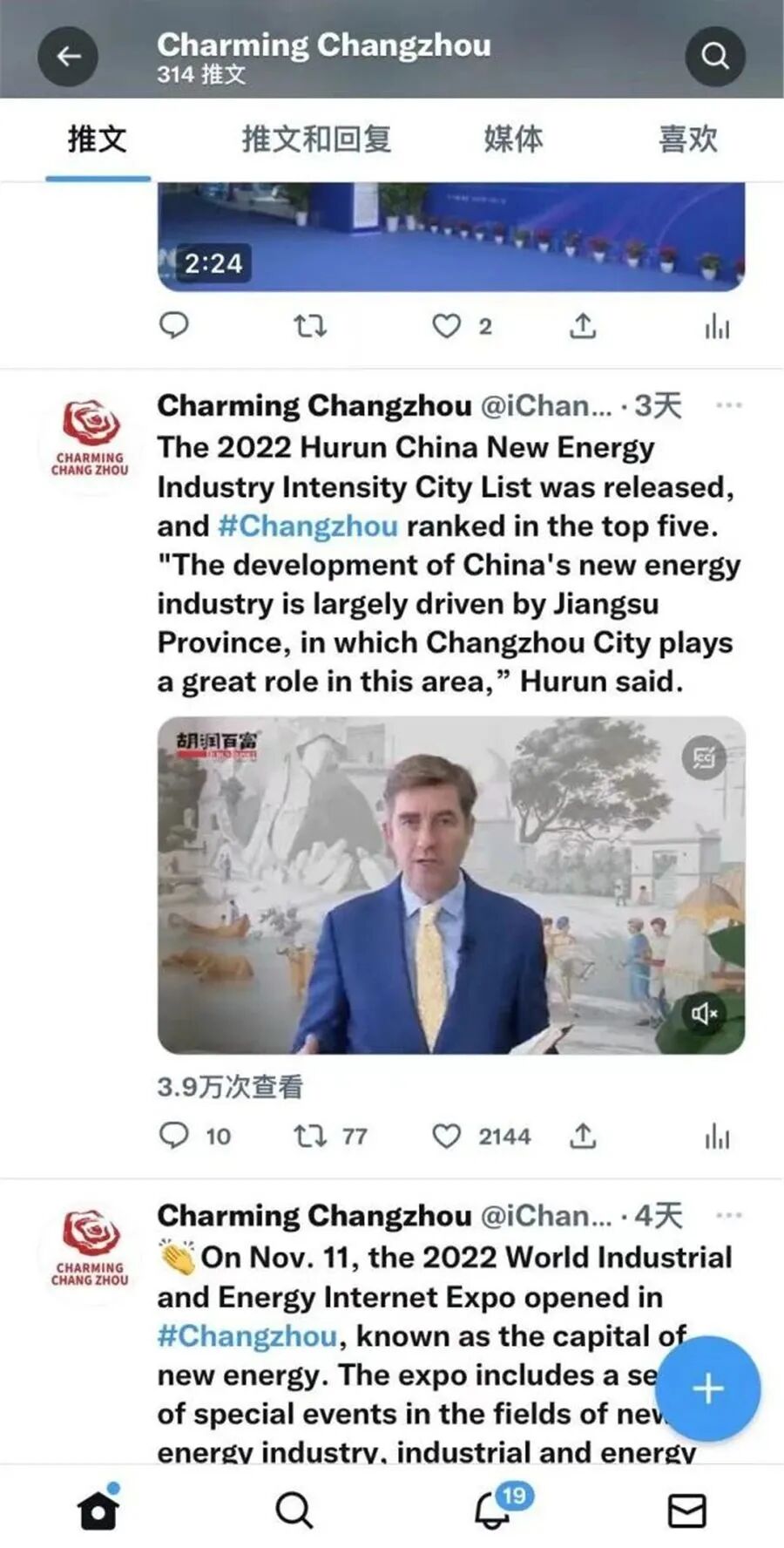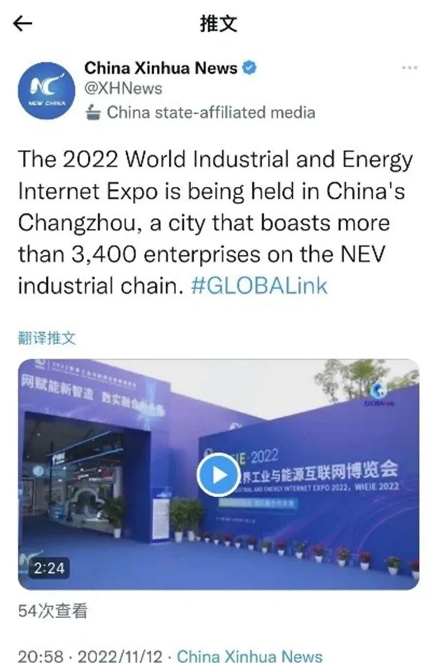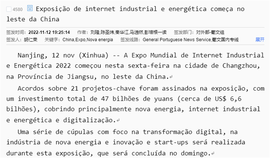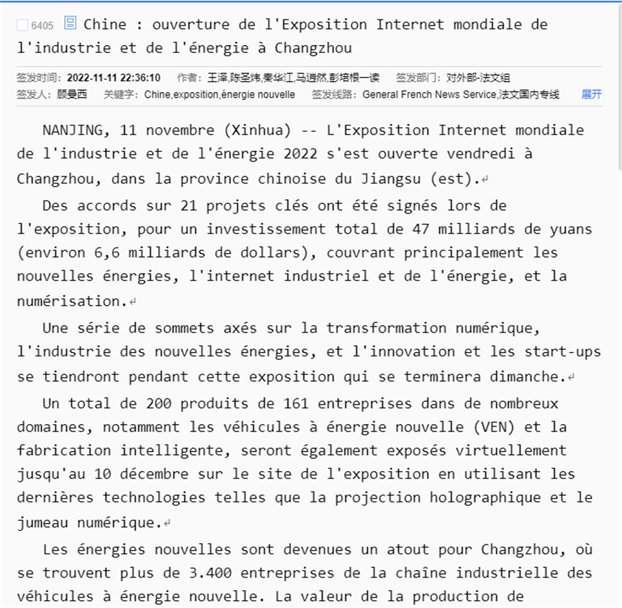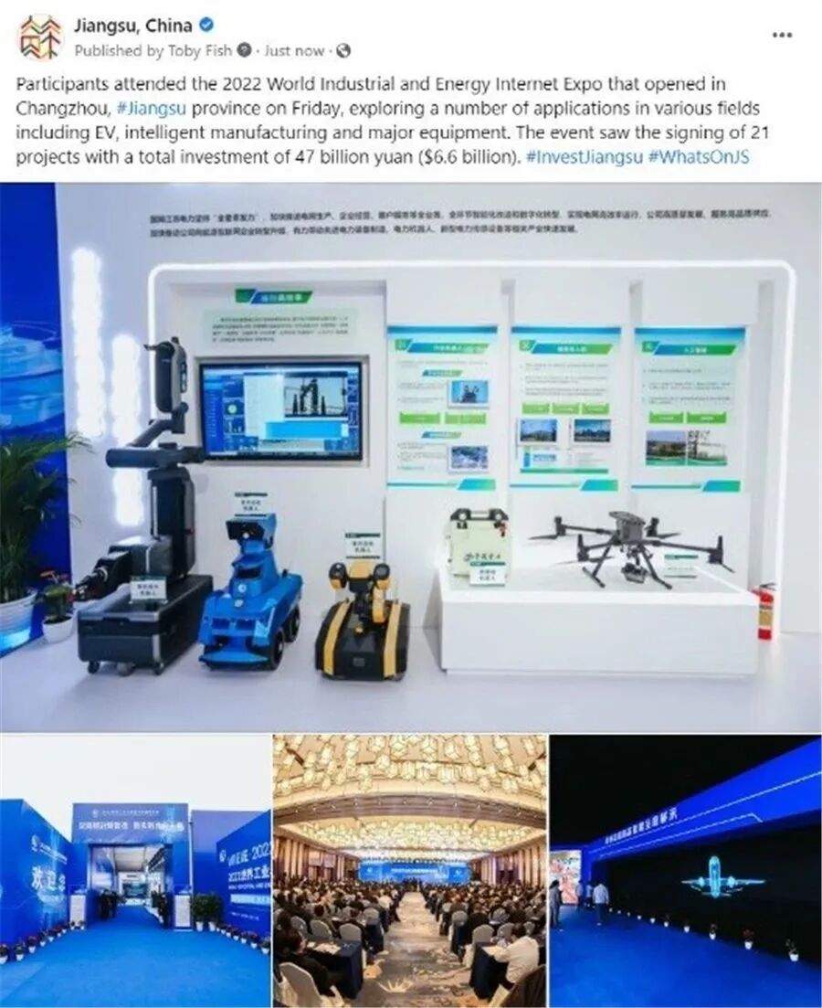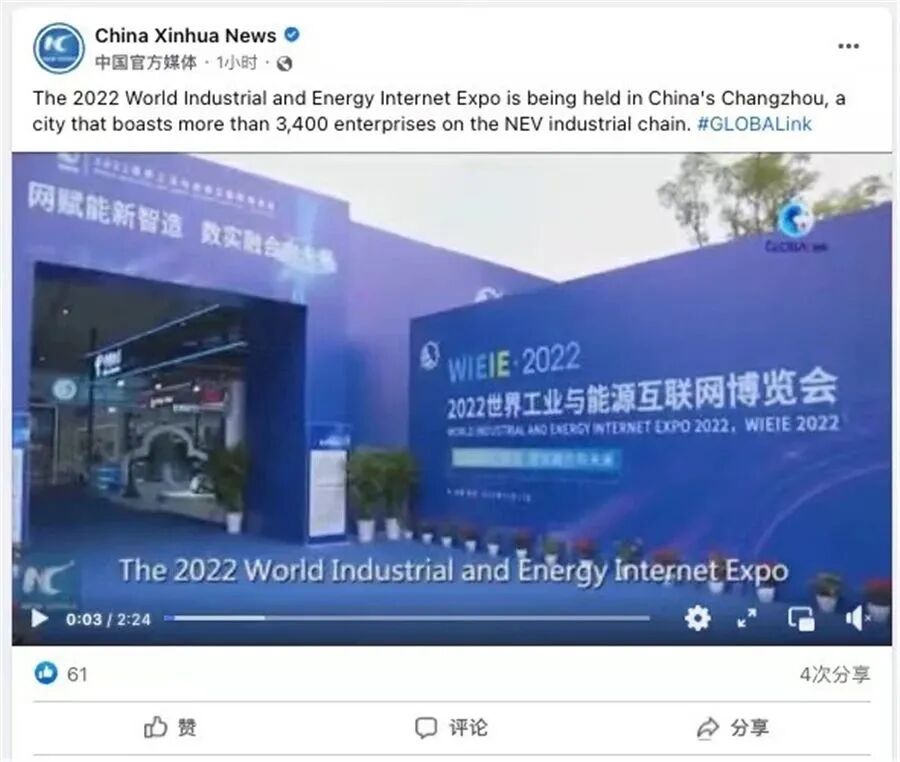 先后三次对接新华社汇报工作,争取支持。新华社刊发全球英文通稿和新华社国际品牌栏目“Xinhua GLOBALink(全球连线)”视频报道《Industrial and energy internet expo kicks off in east China》,意、法、阿、葡、俄等语言专线同步发布,被世界新闻网等多家国际知名通讯社和媒体平台采用。新华丝路还刊发《E. China's Changzhou ranks 5th in 2022 Hurun China New Energy Intensity City list》报道;全球通讯社联盟发布《2022 World Industrial and Energy Internet Expo held in Changzhou》,被美联社、德新社、日本共同社、韩联社等国家通讯社,每日新闻、朝日新闻等主流媒体和雅虎财经、美国广播公司、福克斯有线电视网、以色列新闻网、热门博客Seeking Alpha等转载,海外落地448家媒体、网站,覆盖海外受众3.8亿。此外,在海外社交媒体上新华社“New China”、江苏“Jiangsu”、常州“Charming Changzhou”等账号发布活动信息,向世界展示常州作为“新能源之都”的城市新名片。