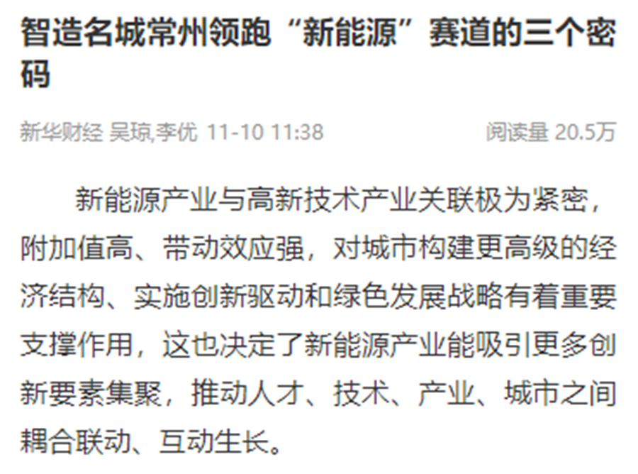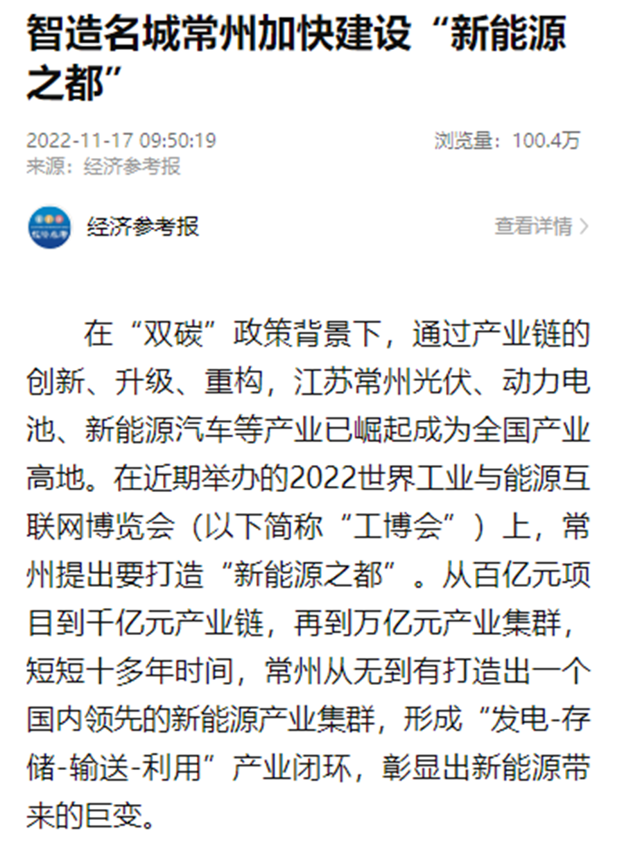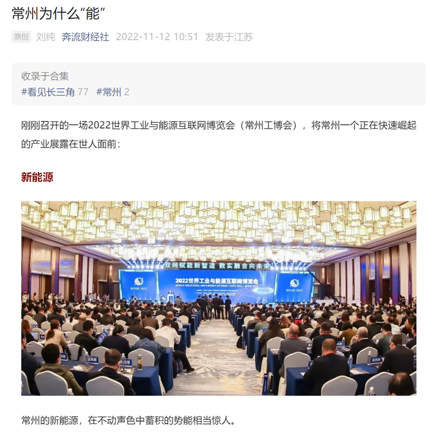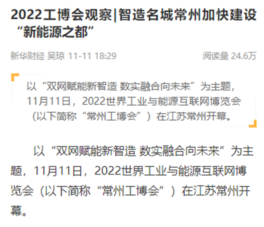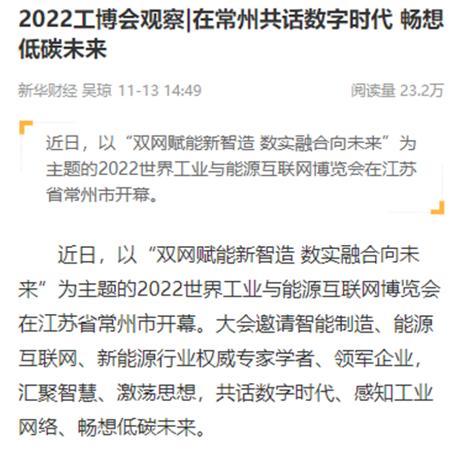 新华社连续刊出《2022世界工业与能源互联网博览会在常开幕,“新能源之都”展宏图》《感知工业网络 畅想低碳未来 2022世界工业与能源互联网博览会在常州开幕》《2022工博会观察|智造名城常州加快建设“新能源之都”》等重点报道,阅读量超200万。