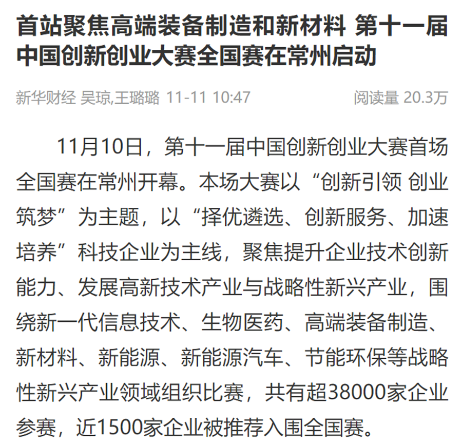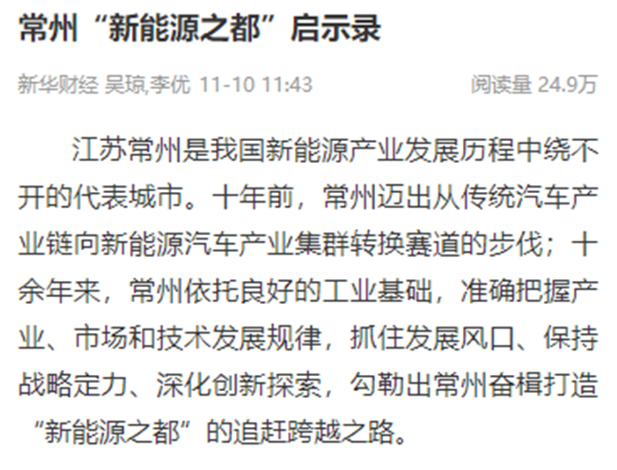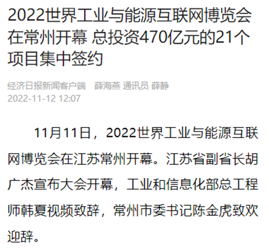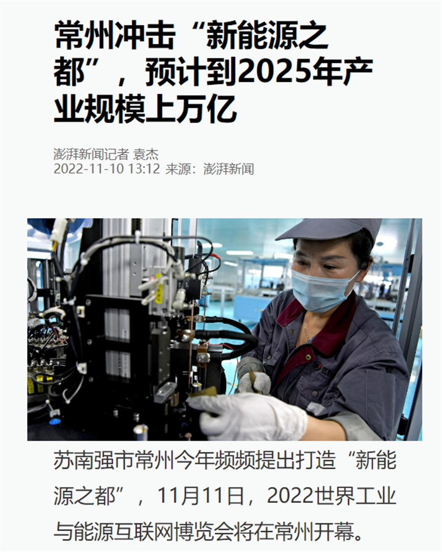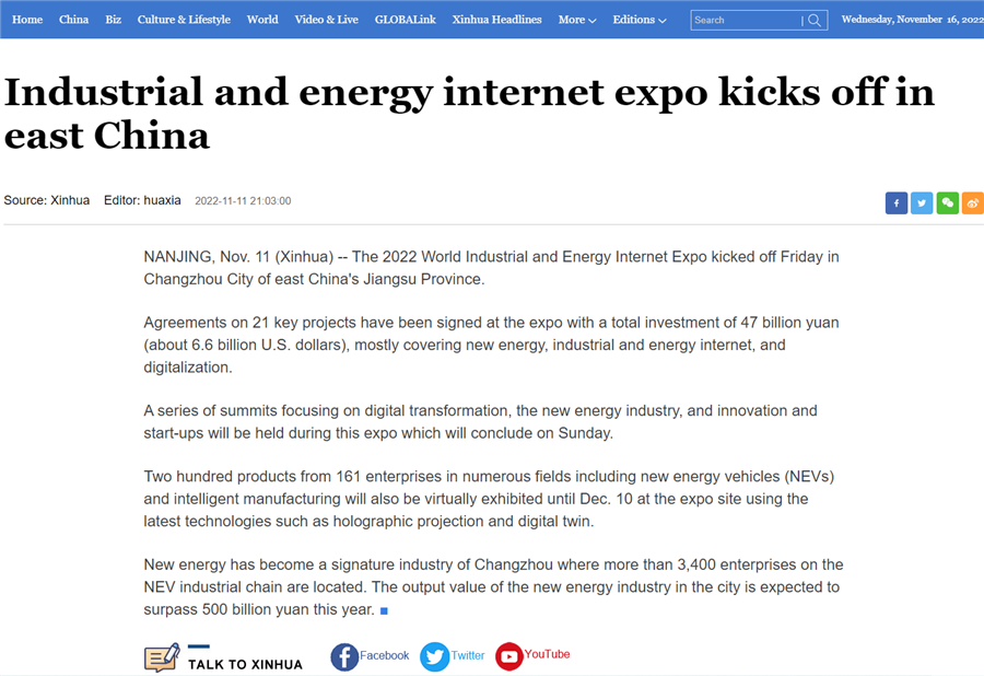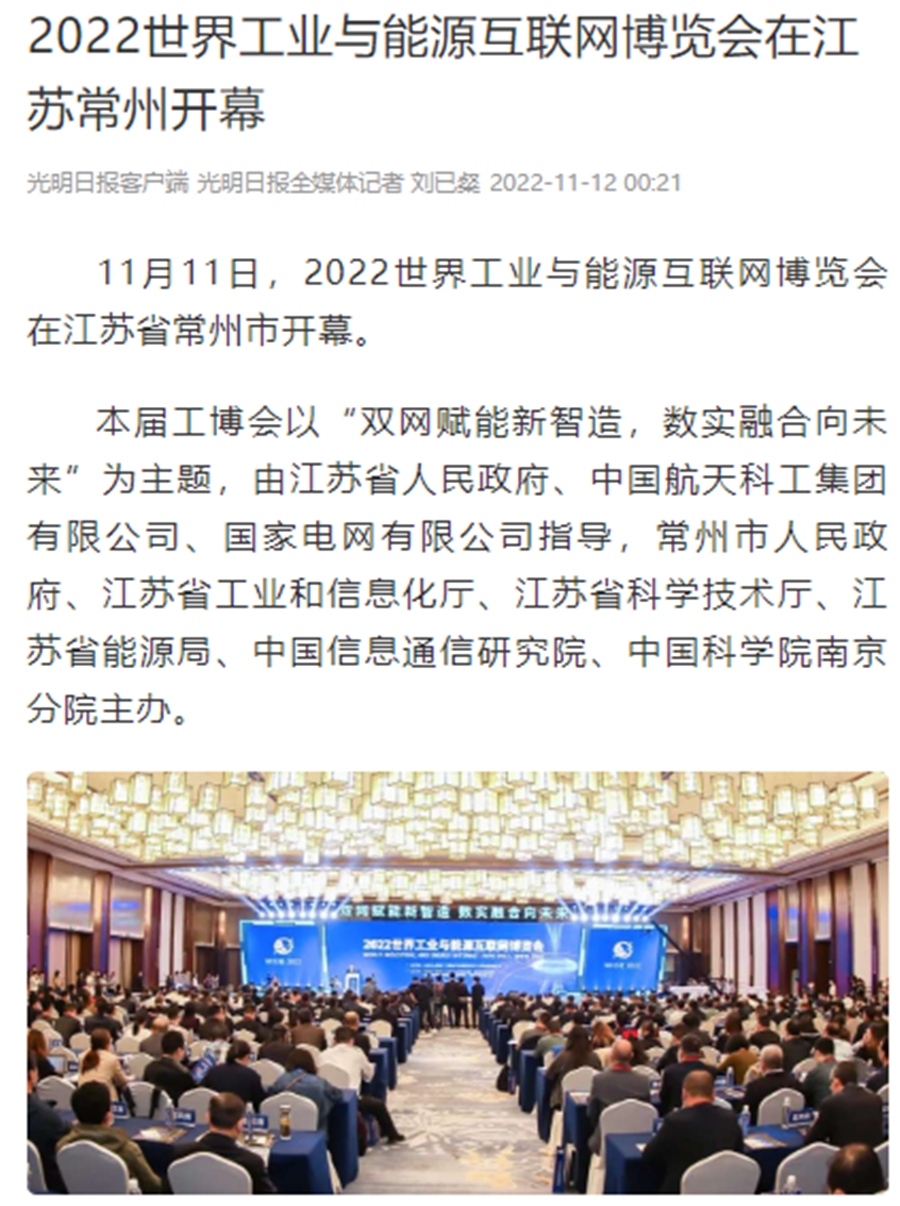 新华社连续刊出《2022世界工业与能源互联网博览会在常开幕,“新能源之都”展宏图》《感知工业网络 畅想低碳未来 2022世界工业与能源互联网博览会在常州开幕》《2022工博会观察|智造名城常州加快建设“新能源之都”》等重点报道,阅读量超200万。