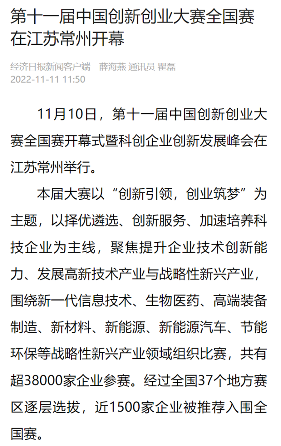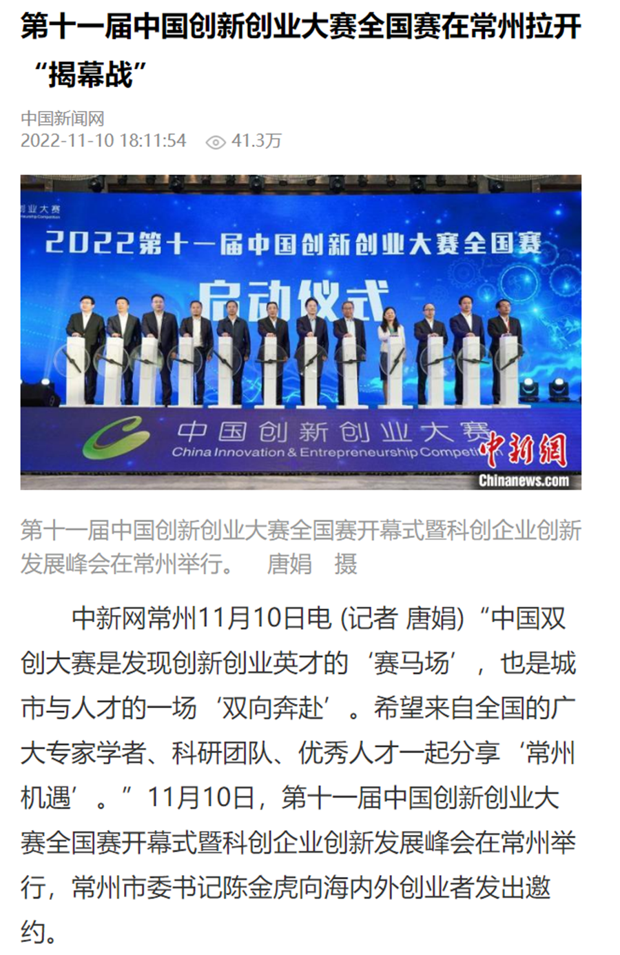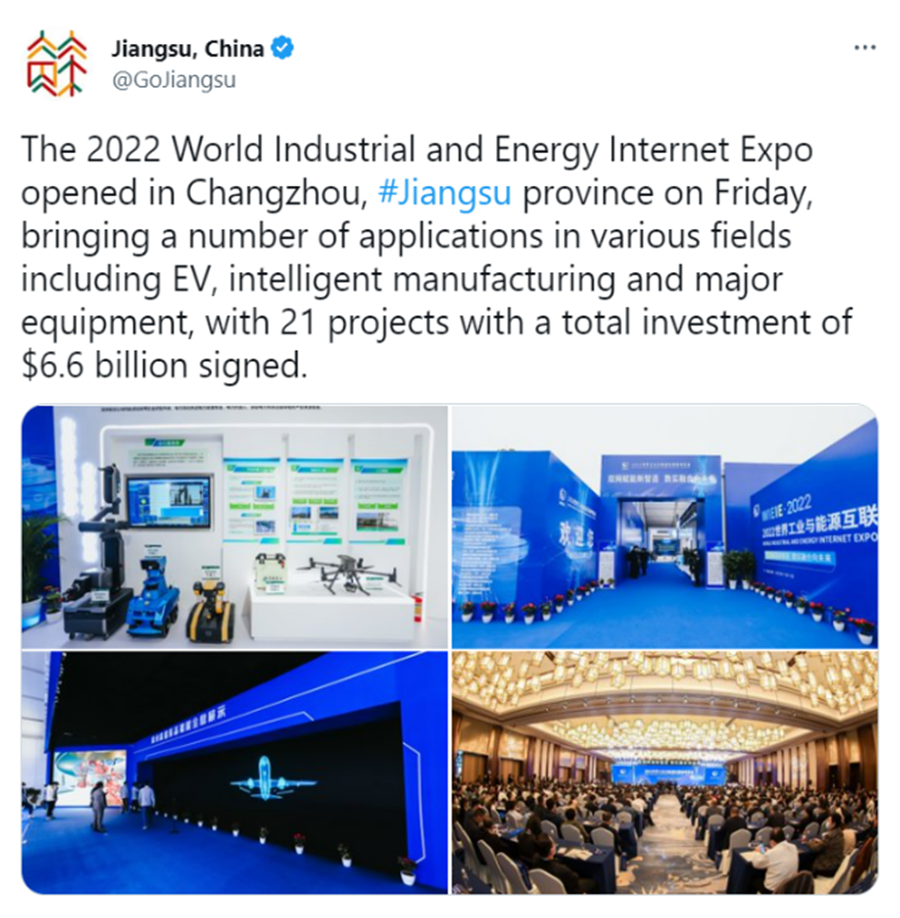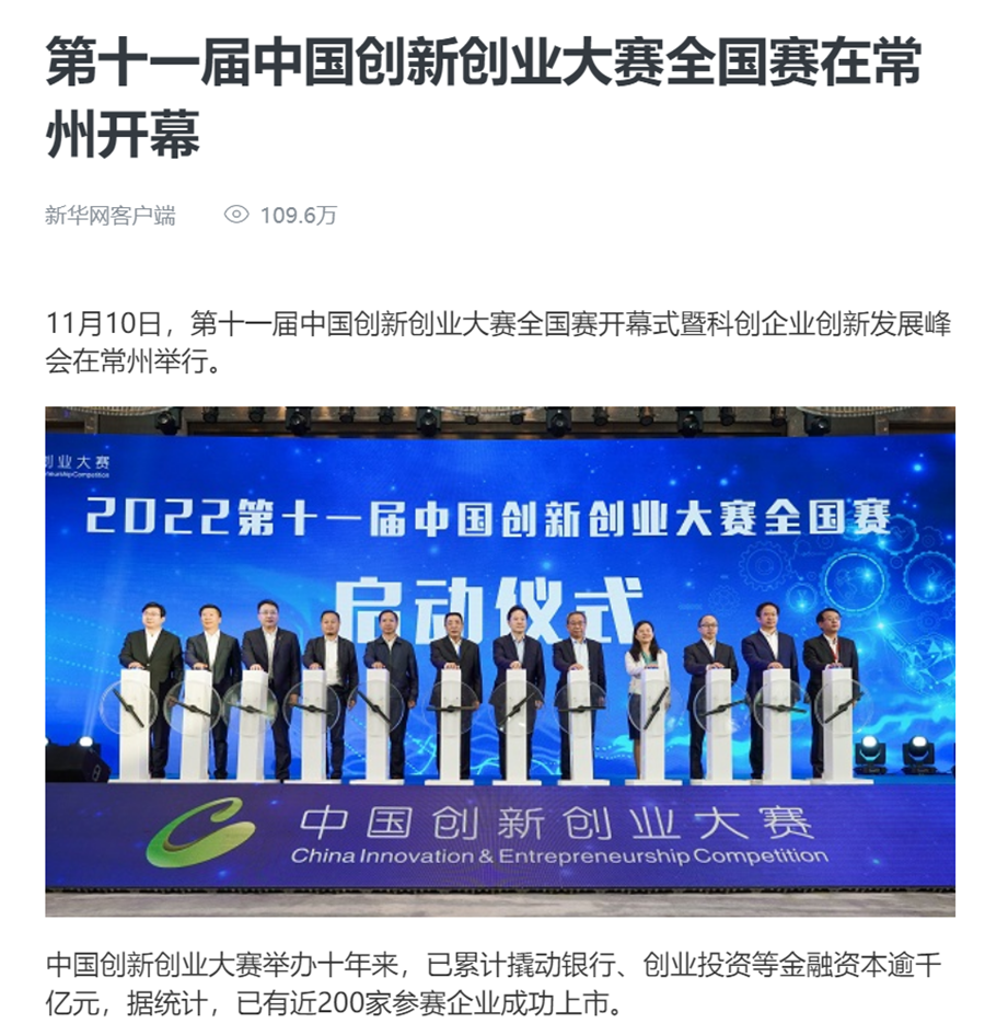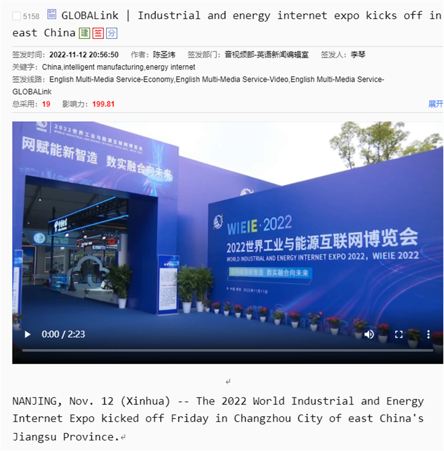 新华社连续刊出《2022世界工业与能源互联网博览会在常开幕,“新能源之都”展宏图》《感知工业网络 畅想低碳未来 2022世界工业与能源互联网博览会在常州开幕》《2022工博会观察|智造名城常州加快建设“新能源之都”》等重点报道,阅读量超200万。
