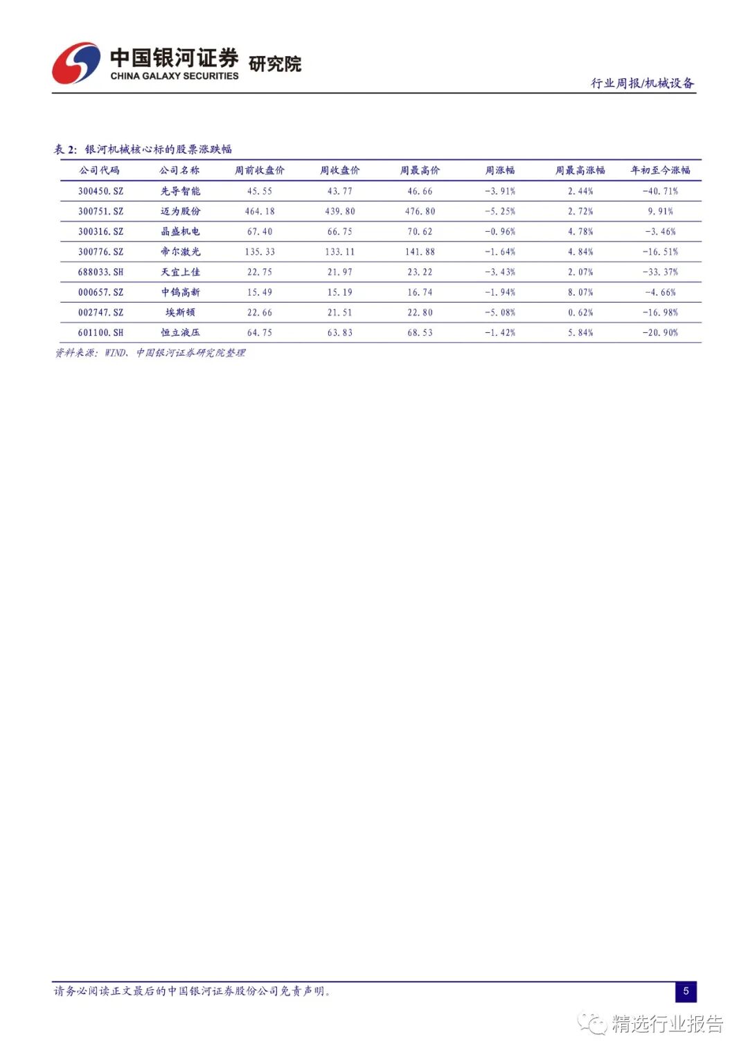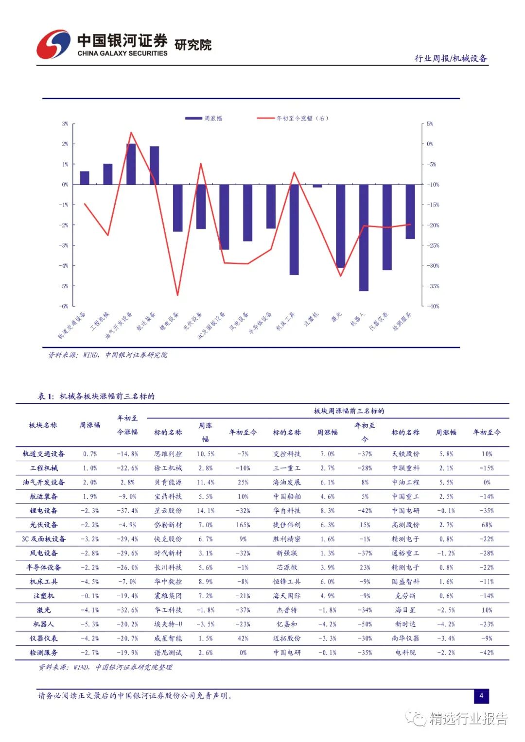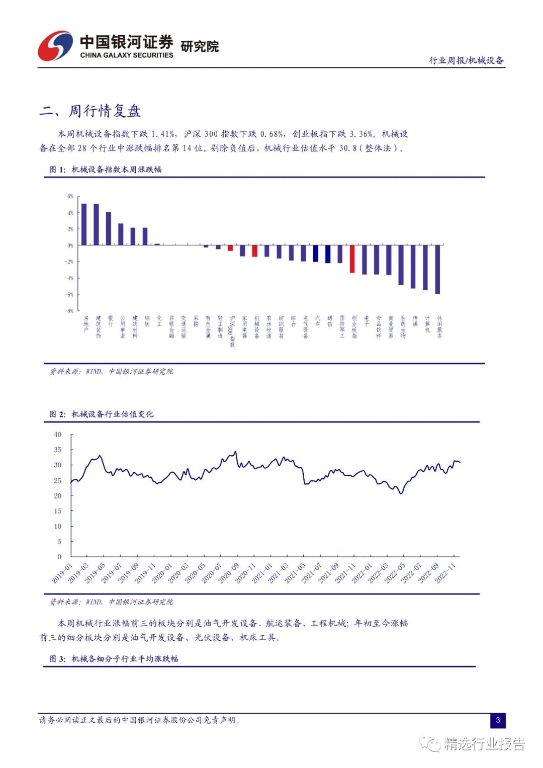 本周机械设备指数下跌 1.41%,沪深 300 指数下跌0.68%,创业板指下跌 3.36%。机械设备在全部 28 个行业中涨跌幅排名第 14 位。剔除负值后,机械行业估值水平 30.8(整体法)。本周机械行业涨幅前三的板块分别是油气开发设备、航运装备、工程机械;年初至今涨幅前三的细分板块分别是油气开发设备、光伏设备、机床工具。