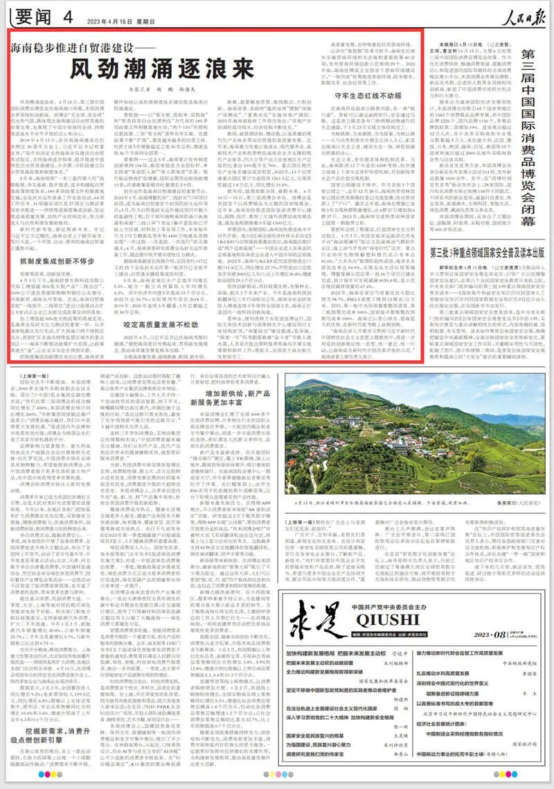 4月16日,《人民日报》04版刊发文章《海南稳步推进自贸港建设——风劲潮涌逐浪来》,版面图及全文如下: