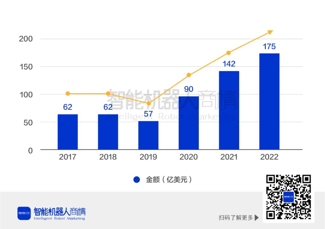 机器人行业发展现状如今,机器人产业正处于行业发展初期,技术研发已不断完善,项目开始大批量落地,产业链发展极为迅猛。中国机器人起步较晚但发展迅速,机器人作为智能制造链条中不可或缺的关键一环,具备极高的市场价值。中国机器人市场从2017年的62.8亿美元增长至2021年的 XXX亿美元,预计2022年将增长至175亿美元。