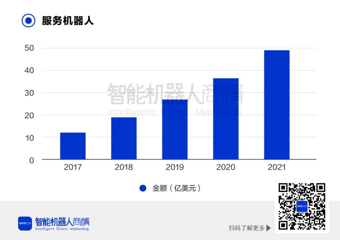 服务机器人可划分为家用服务和商用服务两个类别,随着人工智能、云计算、物联网技术的日益成熟,未来服务机器人的应用场景更加多元化,市场渗透率将不断提高。在2020年市场规模达到14亿美元,2021年再创佳绩,达到49亿美元。2022年多款服务机器人产品相继落地,进一步打破了用户对机器人的传统认知,预计2022年服务机器人的规模将往前更进一步。