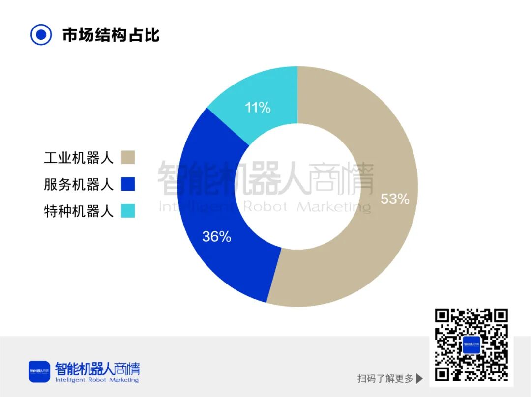 中国机器人市场主要以工业机器人为主,占比约53%,服务机器人和特种机器人占比较少,分别为36%和11%。