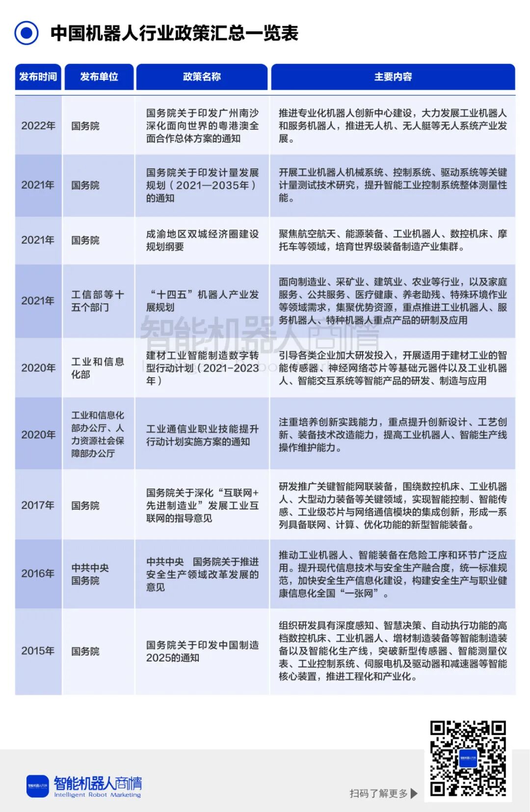 机器人行业发展政策近年来,国家颁布多项政策来推动机器人的产业化进程。2021年12月,工信部等十五部门联合印发的《“十四五”机器人产业发展规划》中提出,到2025年我国成为全球机器人技术创新策源地、高端制造集聚地和集成应用新高地。在政府的支持以及众多企业的布局将快速推动国产机器人产业的发展,机器人行业发展前景广阔。