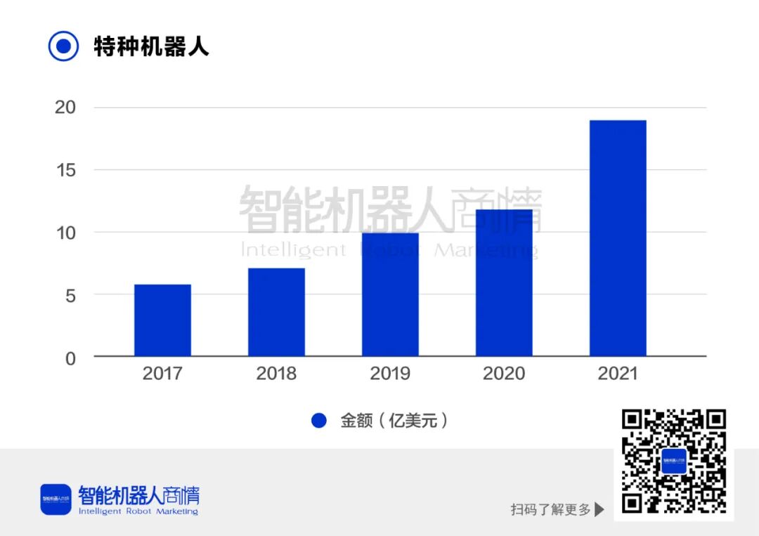 特种机器人产业发展良好,创新企业加快自主研发进程,产品的功能性与可靠性大幅提升,在安防巡逻、电力巡检、防爆灭火、管道检测、采矿挖掘、水下作业、军事作战等场景下得到进一步推广使用。2021年中国特种机器人市场规模达到18亿美元,对特种机器人的需求不断提高,拉动市场高景气增长。