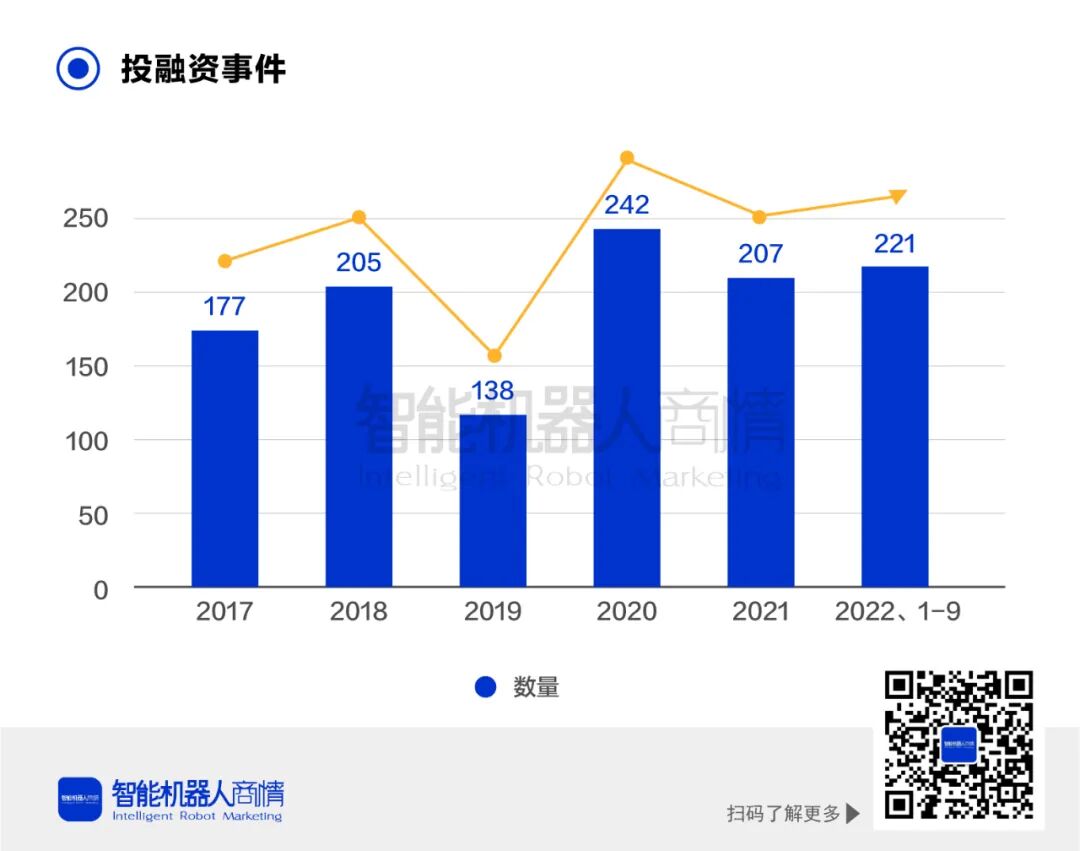 投融资情况2017-2021年,中国机器人领域融资次数趋势较为稳定,总融资次数969起,2022年1-9月共发生221起融资事件,资本关注度持续提升。