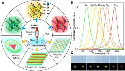 当将飞秒激光聚焦到材料内部时,会产生各种高度非线性效应,这种极端条件下光与物质相互作用充满未知和挑战。浙江大学邱建荣团队及其合作者们发现了飞秒激光诱导复杂体系微纳结构形成的新机制。以含氯溴碘离子的氧化物玻璃体系为例,实现了玻璃中具有成分和带隙可控发光可调的钙钛矿纳米晶3D直接光刻,呈现红橙黄绿蓝等不同颜色的发光。形成的纳米晶在紫外线辐照、有机溶液浸泡和250℃高温环境中表现出显著的稳定性。