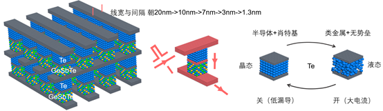高密度与海量存储是大数据时代信息技术与数字经济发展的关键瓶颈。中国科学院上海微系统与信息技术研究所宋志棠、朱敏团队发明了一种基于单质碲和氮化钛电极界面效应的新型开关器件,充分发挥纳米尺度二维限定性结构中碲熔融—结晶速度快、功耗低的独特优势,“开态”碲处于熔融状态是类金属,和氮化钛电极形成欧姆接触,提供强大的电流驱动能力,“关态”半导体单质碲和氮化钛电极形成肖特基势垒,彻底夹断电流。