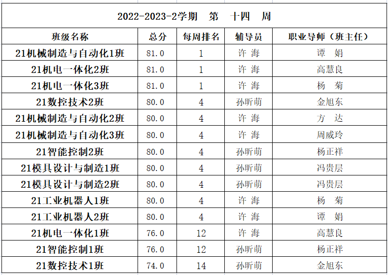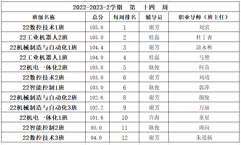 【智能制造学院2022-2023-2学期第十四周班级量化考核】