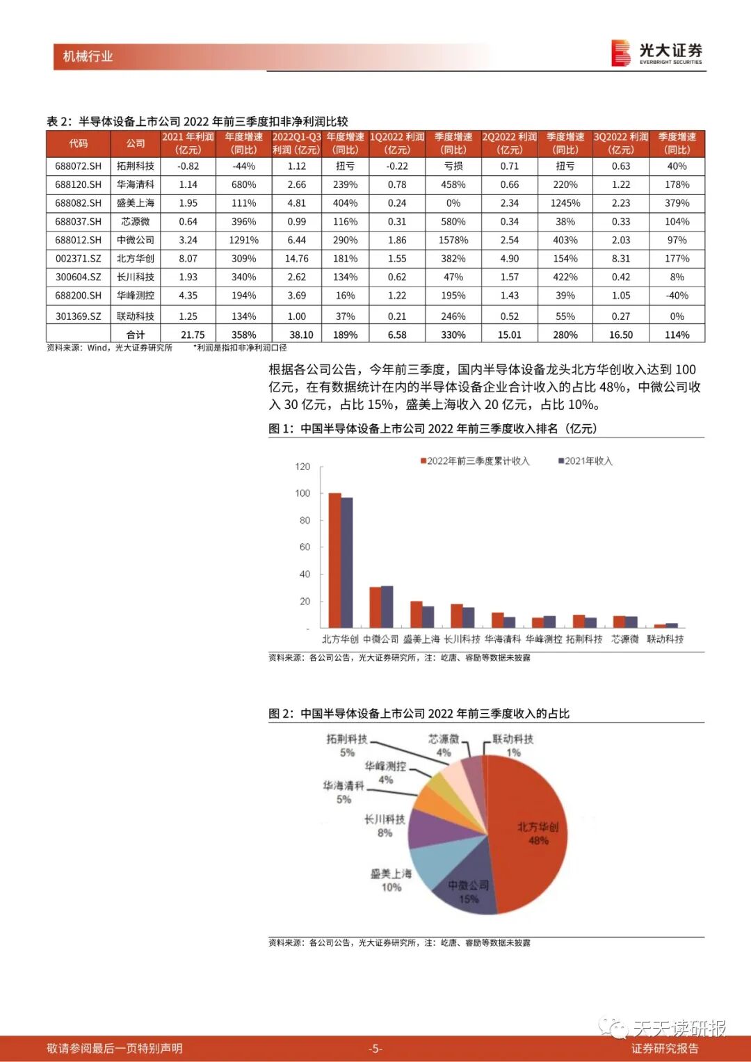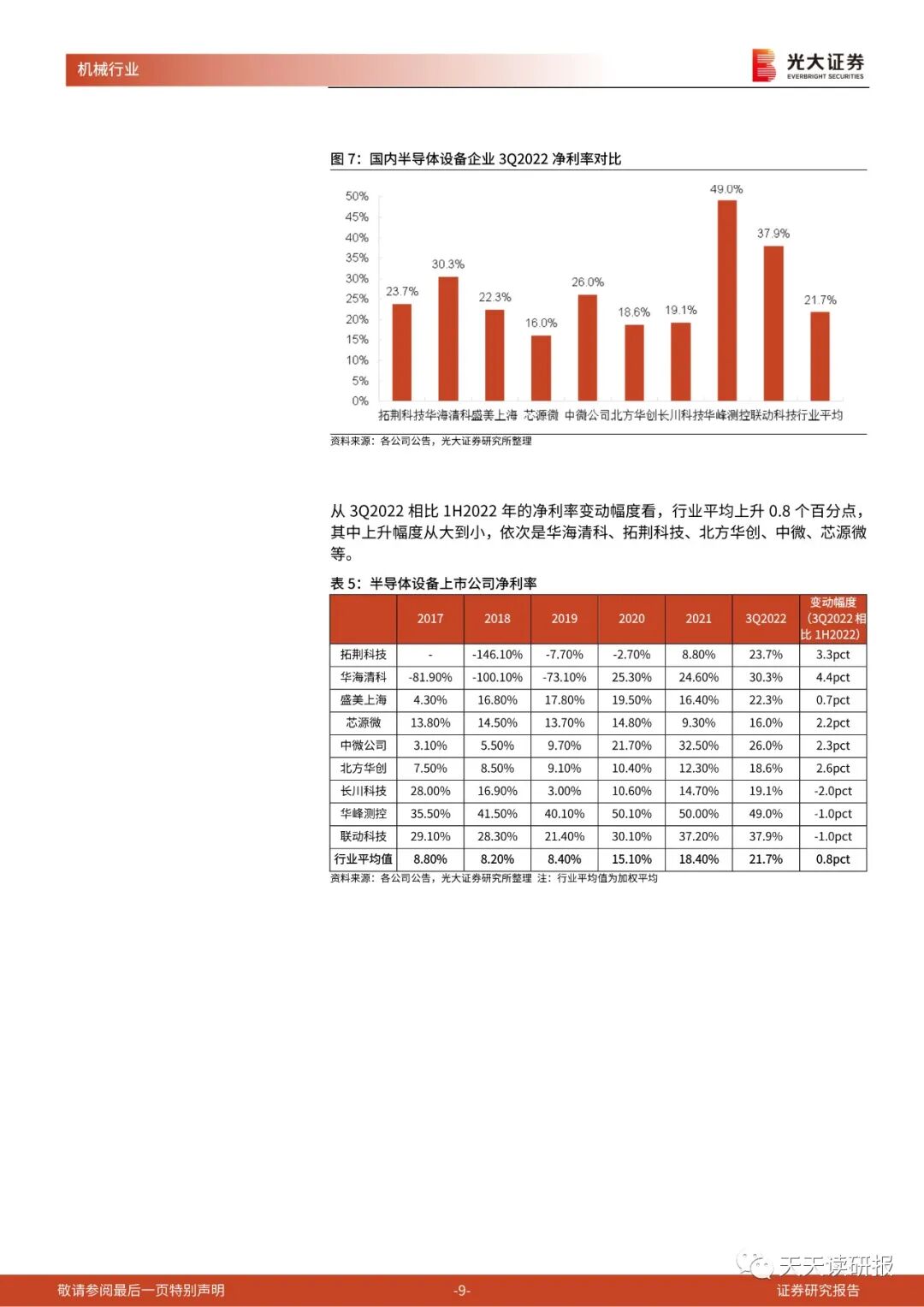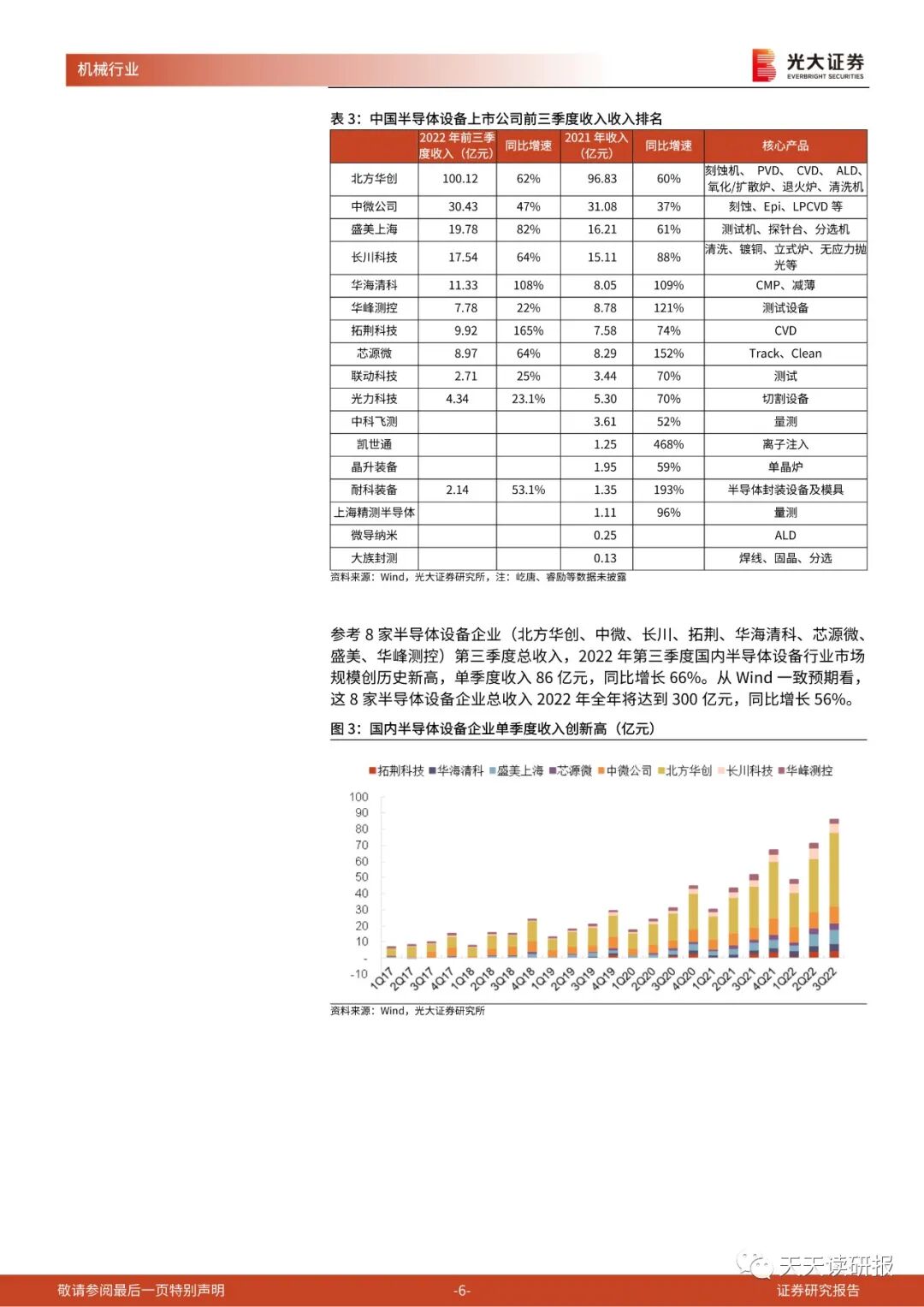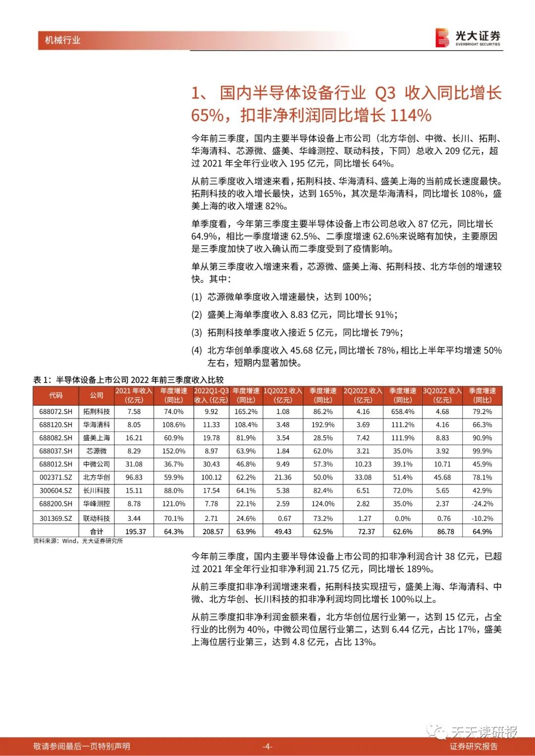 国内半导体设备上市公司业绩加速增长。3Q22 半导体设备行业总收入同比增长65%,其中芯源微单季度收入增速最快,达到 100%,盛美上海单季度收入同比增长 91%,拓荆科技单季度收入同比增长 79%,北方华创单季度收入 45.68亿元,同比增长 78%。