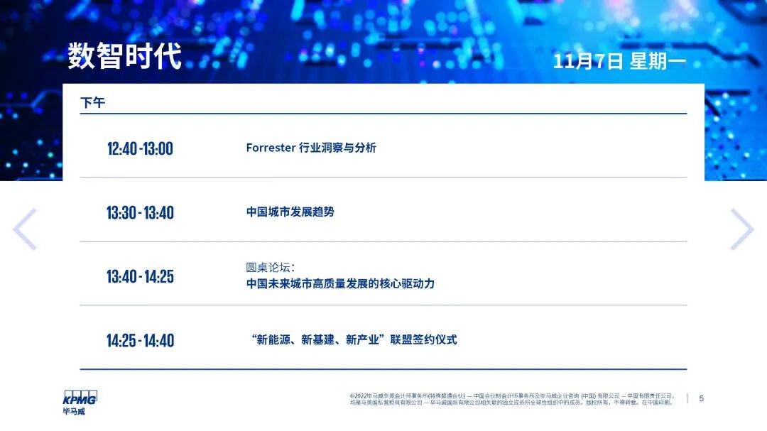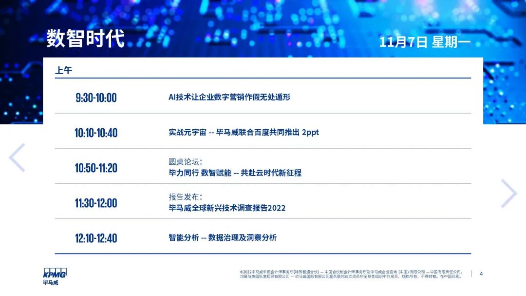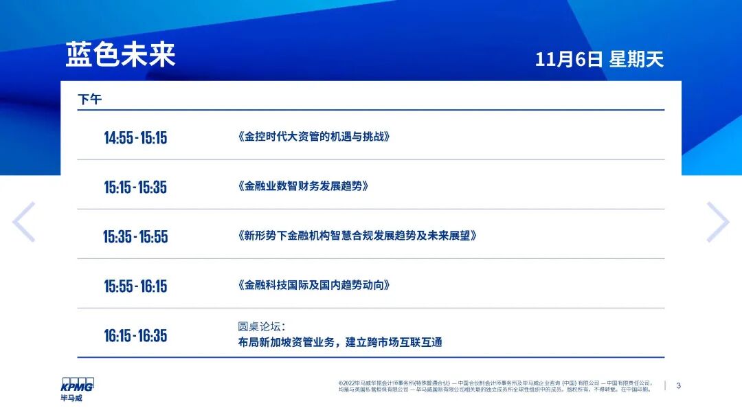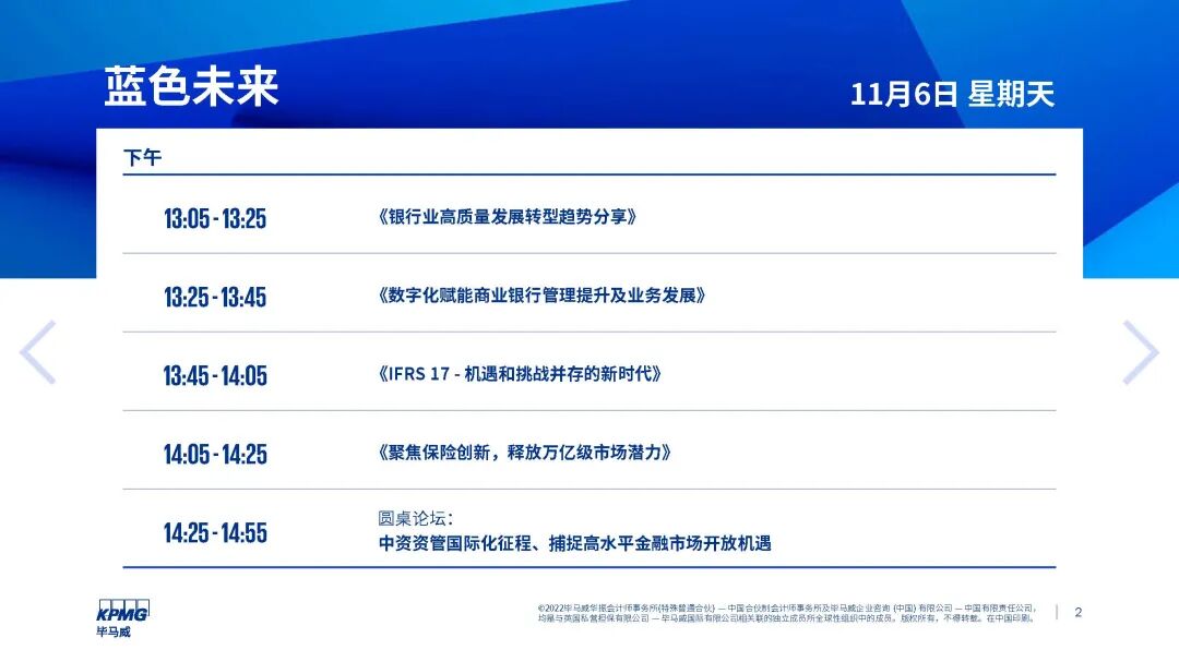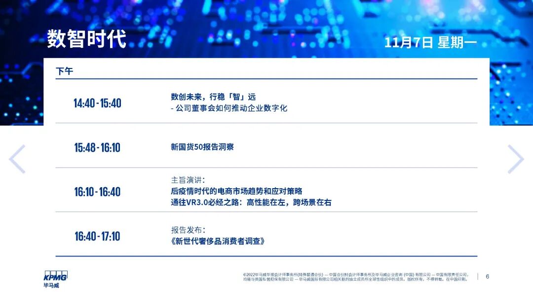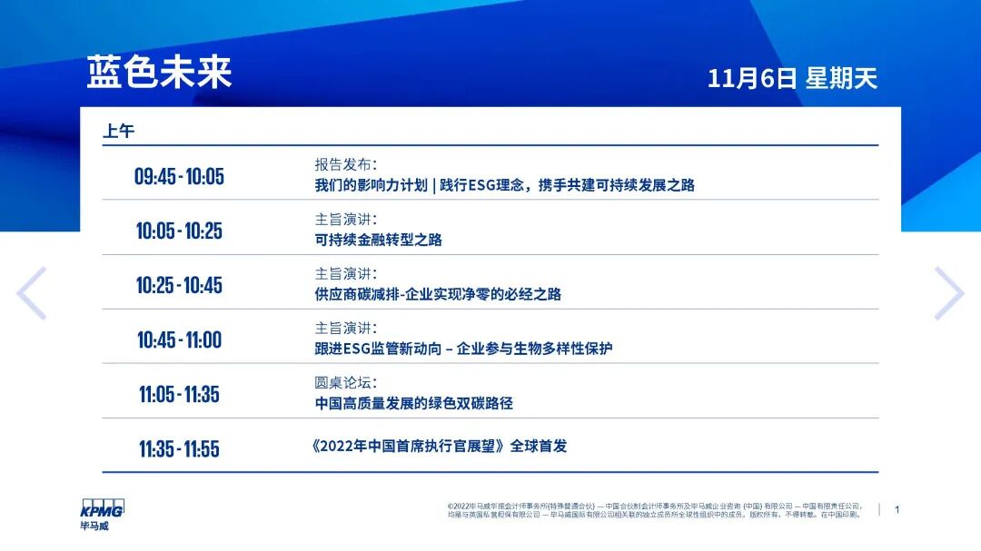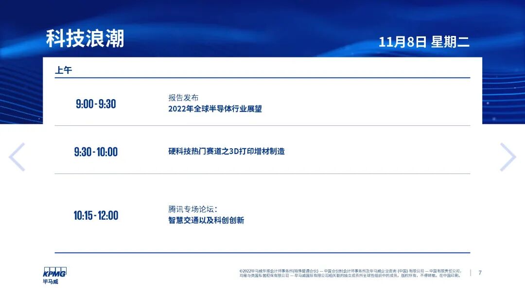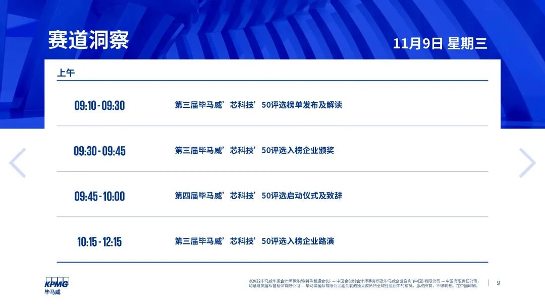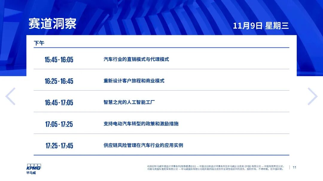 毕马威中国将连续第五年参与中国国际进口博览会。在今年的进博会舞台上,毕马威中国将以“专注洞见,清晰呈现”为主题,通过多屏互动的展台向诸位来宾展示我们在审计、税务以及咨询三大专业服务领域的深刻洞见,并将聚焦新形势下市场发展的多维机遇与挑战,围绕环境、社会和治理(ESG)、金融行业、数智转型、TMT(科技、媒体与通信)、智慧政府、芯片科技、汽车科技、生命科学与健康以及新消费等热点话题展开深入分享。