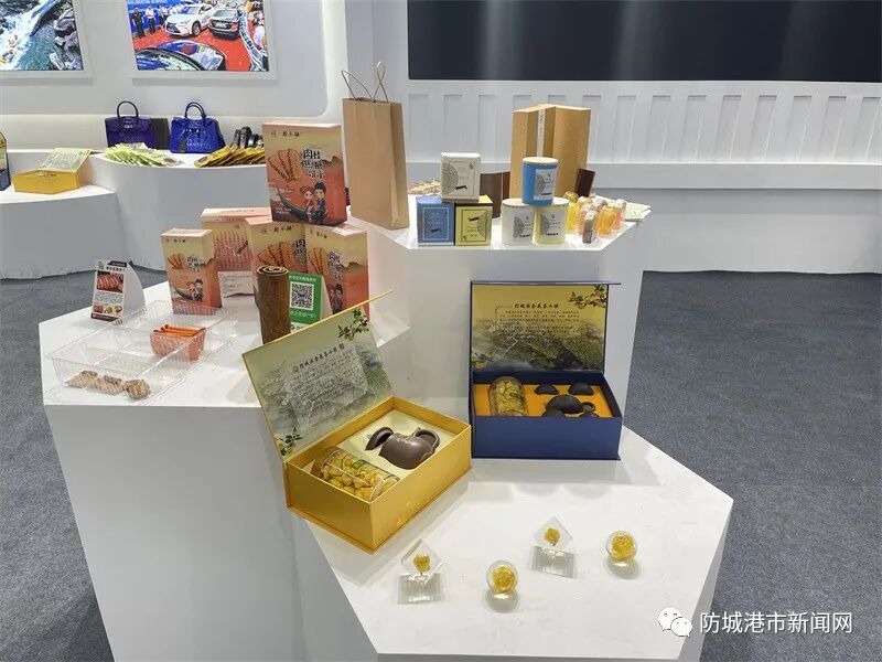 “海边山”风情文创产品、金花茶、防城港海鲜粉、肉桂八角等丰富的展品吸引不少观展者进入防城港展馆。现场工作人员还通过向参展嘉宾、市民游客发放各类文旅宣传资料,播放防城港文旅宣传片、现场解答嘉宾游客的提问等方式来宣传防城港市的优质文旅资源,让嘉宾游客感受防城港“海边山”的独特魅力。
