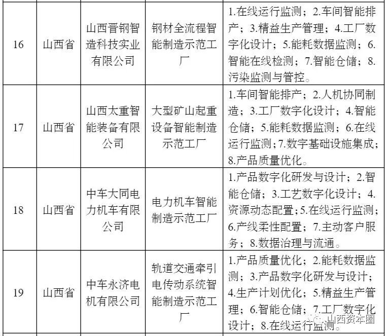 公示名单显示,山西省共有4家晋企成为2022年度智能制造示范工厂揭榜单位,分别为山西晋钢智造科技实业有限公司(钢材全流程智能制造示范工厂)、山西太重智能装备有限公司(大型矿山起重设备智能制造示范工厂)、中车大同电力机车有限公司(电力机车智能制造示范工厂)和中车永济电机有限公司(轨道交通牵引电传动系统智能制造示范工厂)。