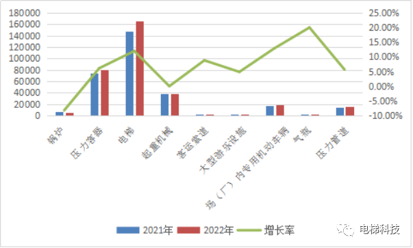 同比2021年,2022年特种设备数量变化较大的是锅炉、气瓶、场(厂)内专用机动车辆和电梯。锅炉减少525台,降幅8.25%,气瓶增加60余万只,增幅20%,场(厂)内专用机动车辆增加2万余台,增幅12.9%,电梯增加1万7千余部,增幅12%。